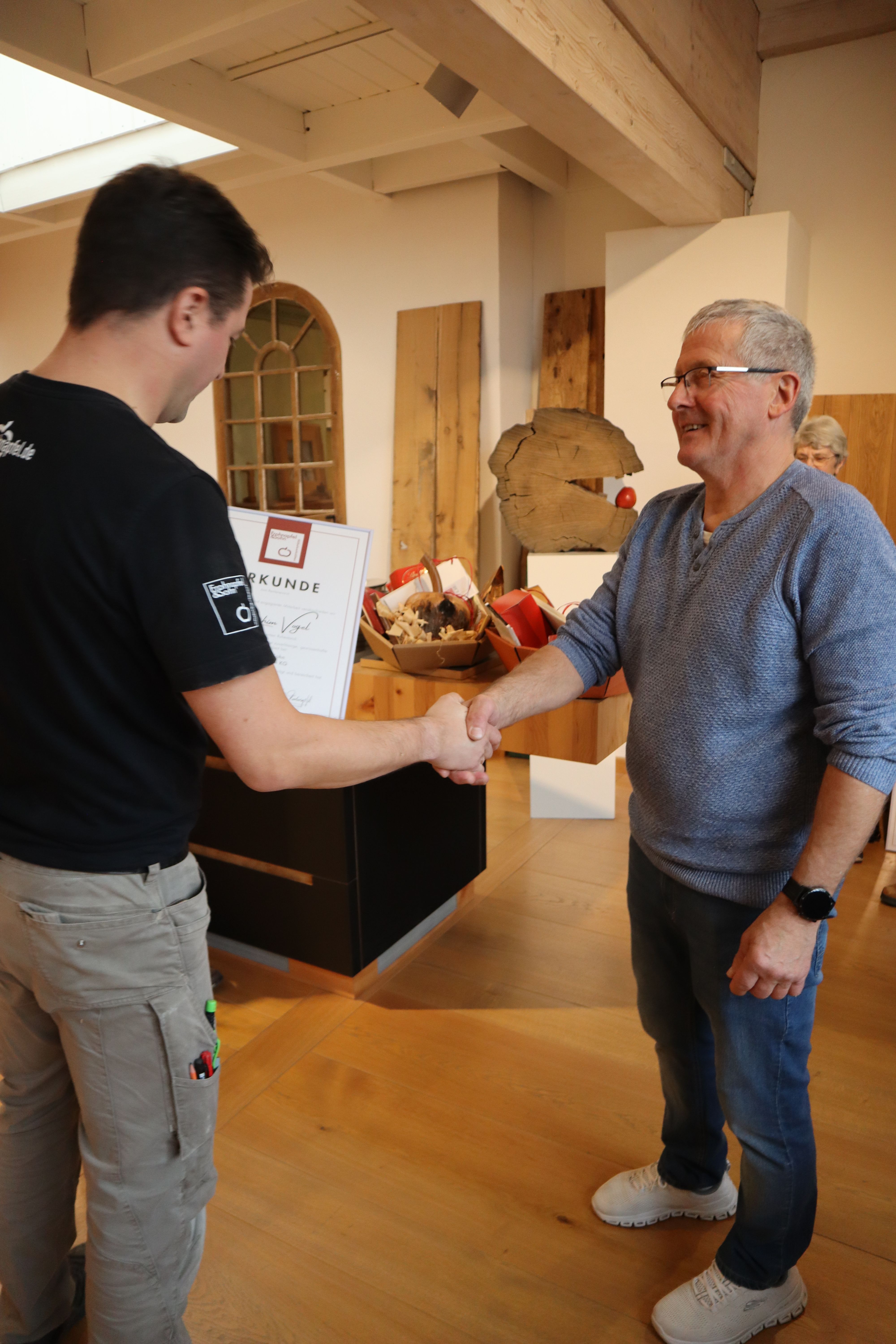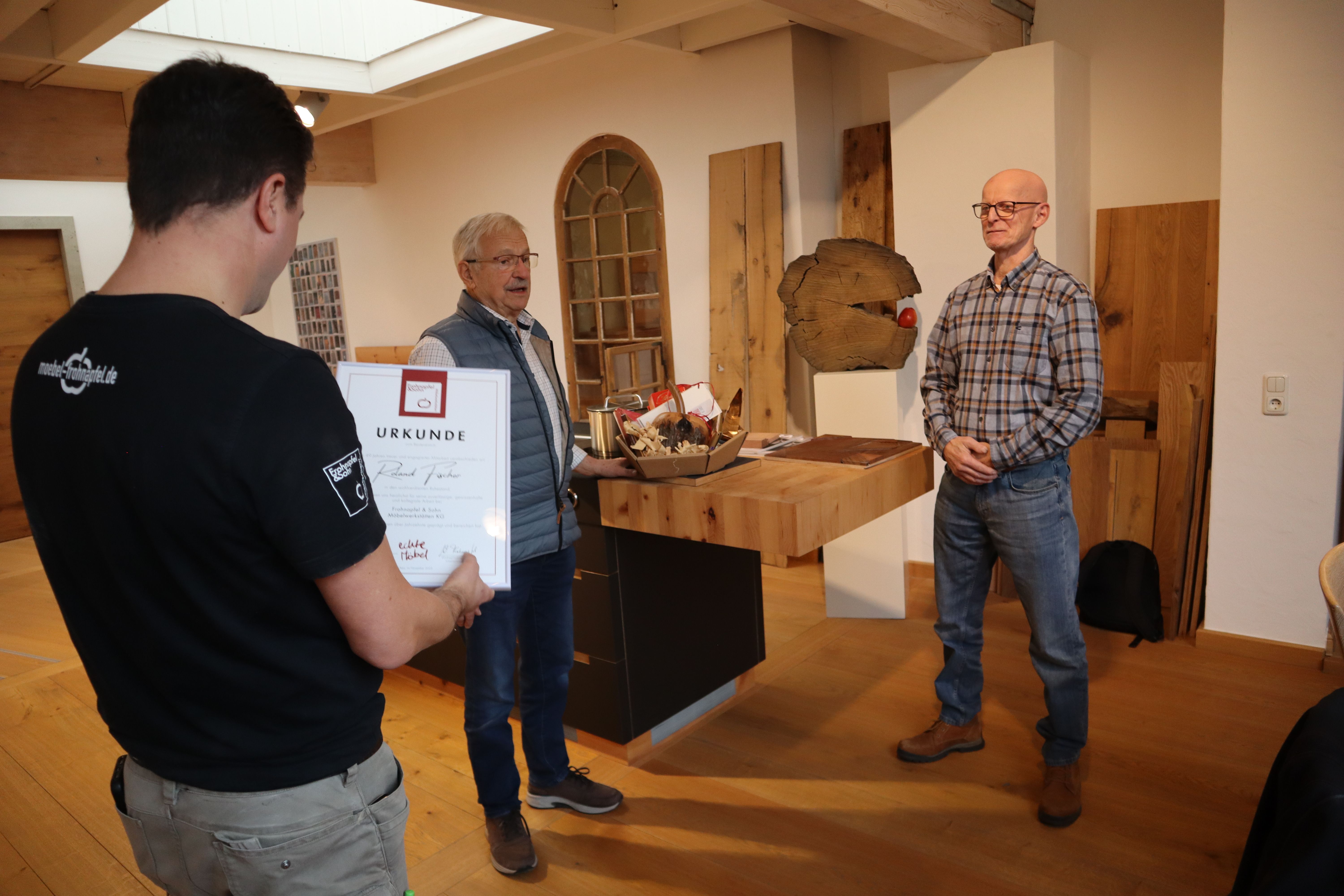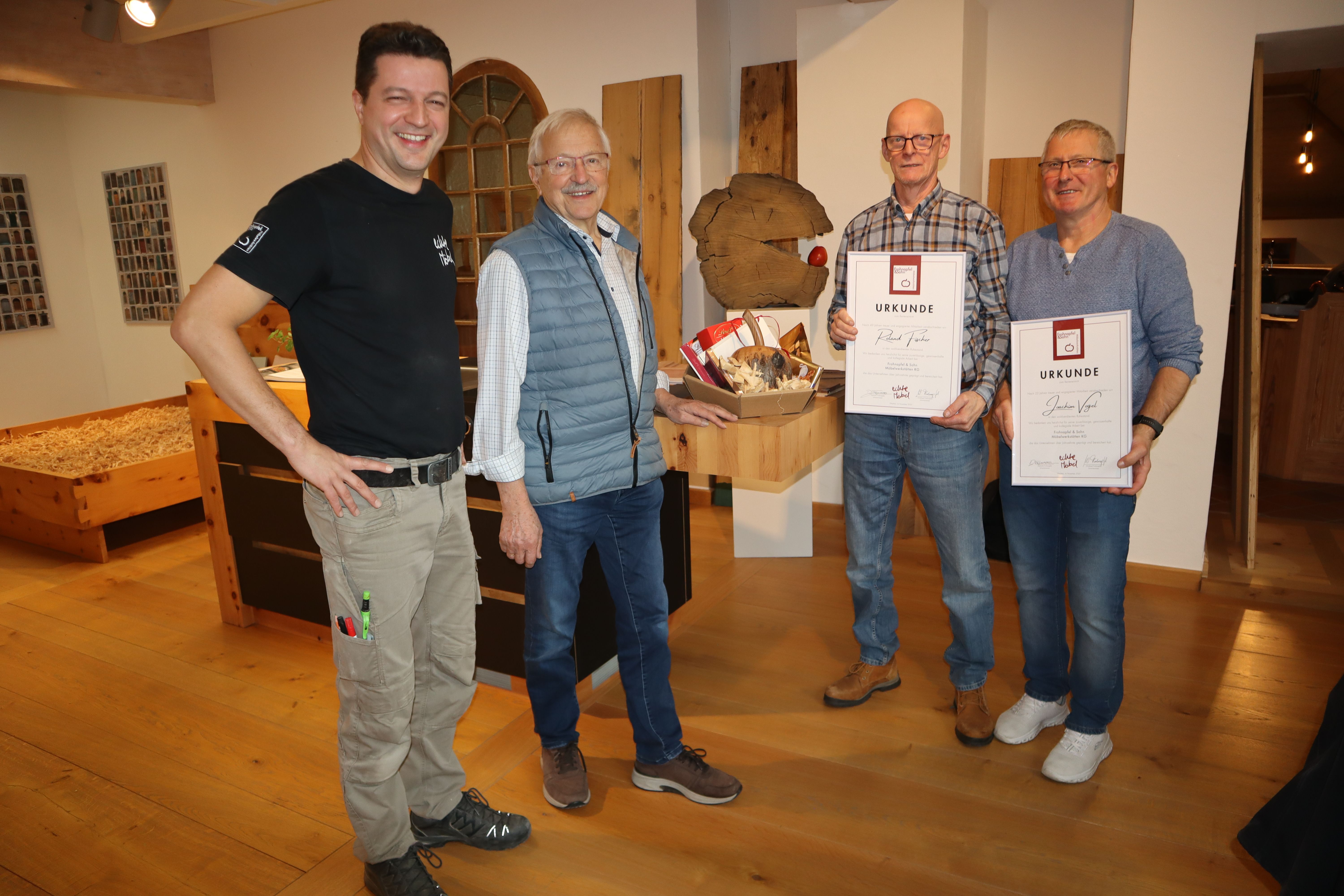 Im November 2025 haben wir nach langer Betriebszugehörigkeit zwei engagierte Mitarbeiter in den wohlverdienten Ruhestand entlassen. Roland Fischer war 49 Jahre und Joachim Vogel war 22 Jahre in unserer Schreinerei tätig. Wir bedanken uns herzlichst für ihre zuverlässige, gewissenhafte und kollegiale Arbeit die das Unternehmen über Jahrzehnte geprägt und bereichert hat.